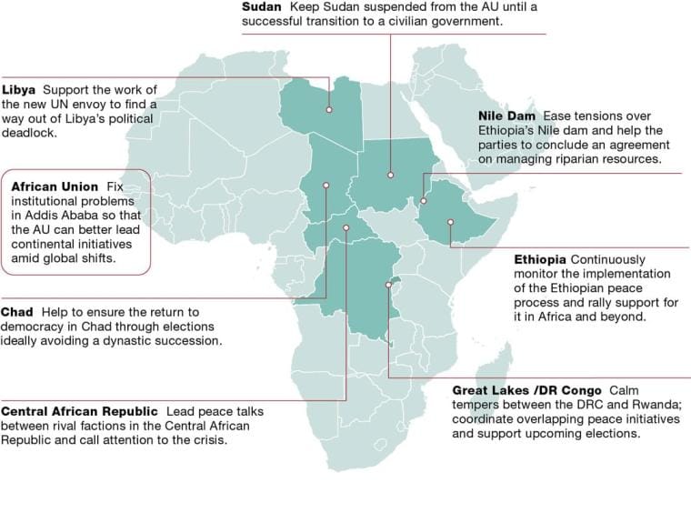 Heads of states and delegates stand for the African Union (AU) anthem during the 35th ordinary session of the Assembly of the African Union at the African Union Commission (AUC) headquarters in Addis Ababa, Ethiopia, February 5, 2022. REUTERS / Tiksa Negeri Briefing / Africa 14 February 2023 20+ minutes Eight Priorities for the African Union in 2023 The African Union has more than a full plate of peace and security issues before it in the coming year. This briefing highlights eight conflict situations where its efforts can be of greatest help. Share Facebook Twitter Email Linkedin Whatsapp Save Print Download PDF Full Report Also available in Français Français English What’s new? In the third week of February, the African Union (AU) will hold its annual heads of state summit. The meeting affords African leaders a chance to assess the AU’s readiness to confront the numerous internal and external challenges the continent faces in the year ahead. Why does it matter? Recent years have been marked by bloody civil wars, armed insurrections, coups and other crises that have spread instability and cost thousands of lives on the continent. External shocks have contributed to instability. While agreements reached in 2022 offer hope in some places, renewed hostilities have flared elsewhere. What should be done? This briefing sets out eight priorities the AU should focus on in 2023: reforming its own institutions; nurturing agreements in Ethiopia and Sudan; urging regional cooperation around the Grand Ethiopian Renaissance Dam; easing tensions in the Great Lakes and Central Africa; and steering talks to unlock Libya’s stalemated transition. Overview The 2023 African Union (AU) heads of state summit will take place at an especially delicate moment for the continent. The past two years have brought deadly internationalised civil wars in Ethiopia and the eastern Democratic Republic of Congo (DRC). The situation in the central Sahel shows no sign of improving, with armed groups destabilising swathes of it and seeking footholds elsewhere. Somalia, Mozambique and other countries, such as in the Lake Chad basin, continue to battle jihadist insurgencies. Intercommunal fighting rages in South Sudan. Russia’s full-scale assault on Ukraine, meanwhile, unfolded just as much of Africa was charting a path to economic recovery after the shock of COVID-19. The invasion, and the Western sanctions that followed, have rattled African economies and left many in deep distress. Amid all this ferment, the leaders meeting in Addis Ababa should concentrate on crises where new or intensified efforts by the AU can be of greatest help, while recommitting to norms and reforms that will better enable the body to do its job. The summit will see the chair of the assembly of heads of state, the AU’s highest decision-making body, pass from Senegal to the tiny Indian Ocean archipelago of Comoros. The handover will occur in line with an AU tradition of rotating the position. The new chair, Comoros President Azali Assoumani, will require the support of other senior African leaders to discharge the role, given his country’s limited diplomatic heft. The heads of state will have some recent successes to build on. When COVID-19 struck, the continental body rallied in coordination with the World Health Organization and Africa Centres for Disease Control and Prevention to help member states ramp up screening and testing, as well as obtain vaccines. The continental free trade area endorsed by heads of state in 2018 has secured member state ratification at a rapid clip. In a strikingly positive development, a panel of eminent leaders convened by the AU helped secure a 2 November 2022 agreement that ended fighting in the devastating conflict centred in Ethiopia’s Tigray region. Still, some of these achievements came with caveats. The comprehensive cessation of hostilities deal for Ethiopia was hugely welcome, but the AU Commission drew substantial criticism for not acting more quickly to bring parties to the table. (In fairness, the constraints it faced in negotiating with a major member state that also hosts its headquarters were considerable.) While many governments have ratified the free trade area agreement and might be willing to allow the free movement of goods when it suits them, very few have ratified the accord on free movement of people, raising questions as to how effective the effort will be. Nor is the AU free of institutional challenges. Member state divisions dog its efforts to hold the line on cherished ideals, not least its norm against unconstitutional change of government. As discussed below, that norm suffered when the organisation decided not to suspend Chad’s membership (as its rules prescribe), instead giving it a grace period, after a junta seized power following the death of President Idriss Déby in 2021. The organisation has not repeated that mistake amid a rash of other coups in Sudan, Mali, Burkina Faso and Guinea, but the precedent remains worrying. There are other reasons for concern as well: the flawed execution of personnel reforms intended to streamline the organisation has weakened certain core functions and led talented staff to leave; and perennial struggles to achieve financial self-sufficiency have failed to produce meaningful progress. The [African Union] ... has a more than full plate when it comes to peace and security issues. The organisation also has a more than full plate when it comes to peace and security issues. The 2023 summit will take place ten years after the AU endorsed its flagship Agenda 2063 vision document. That charter lists ending conflict on the continent as a key goal. The gathered heads of state should take the opportunity to examine the AU’s track record, assess ways it can do better and consider where its efforts are especially needed now. A few openings leap out: agreements in Ethiopia and Sudan create an opportunity for the institution to consolidate important