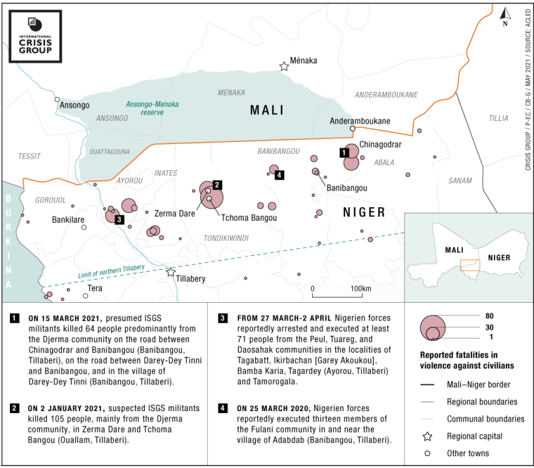 Residents of Zibane-Koira Zéno, a village in the Tillabery region (western Niger close to Mali) attend a meeting on 12 May 2020, after an attack by armed men on 8 May 2020. BOUREIMA HAMA / AFP Briefing / Africa 28 May 2021 20+ minutes Murder in Tillabery: Calming Niger’s Emerging Communal Crisis A spate of mass killings in Niger’s Tillabery region has raised the spectre of broader civil strife. Most worrying is the ethnic dimension to the crimes. Authorities should move quickly to prioritize civilian protection lest vigilantes take matters into their own hands. Share Facebook Twitter Email Linkedin Whatsapp Save Print Download PDF Full Report Also available in Français Français English What’s new? Recent massacres of villagers in Niger’s northern Tillabery region could mark a change in a conflict previously characterised mainly by fighting between jihadists and security forces. Authorities fear the growth of anti-jihadist vigilante groups could fuel more attacks on civilians. Why does it matter? Tensions between jihadists and vigilantes, which often pit communities against one another, could lead to clashes that imperil civilians and pose new challenges for the state, as seen in neighbouring Mali and Burkina Faso. Such clashes could fuel local grievances and provide the Islamic State with additional recruits. What should be done? Niamey should discourage vigilante group formation, which has spurred violence, and mediate communal disputes that fuel armed group recruitment. It should also explore adding locals to the security forces’ ranks, directing them to focus on protecting villagers from banditry, and seek ceasefires with militants. I. Overview Niger’s border region of North Tillabery, reeling from jihadist attacks on security forces, is now at risk of sustained communal violence. On three recent occasions, ethnic Djerma have been massacred, sparking fears of retribution spiralling out of control. An Islamic State affiliate has claimed two of the assaults. Djerma villagers talk of arming themselves against jihadists, who are locally perceived as mostly ethnic Peul and seen as primarily responsible for a surge in crime. As they weigh how to respond, Nigerien authorities should learn from neighbouring Mali and Burkina Faso, both of which have tolerated the emergence of communal militias, only to see the ensuing turmoil drive more civilians into the hands of either jihadists or self-defence groups. Niamey should continue to discourage the formation of militias, step up efforts to protect villages while defusing intercommunal tensions, and keep the door open to dialogue with local militant commanders. It should also address factors underlying the crisis, including land disputes and political rivalries due to decentralisation. Recent events suggest that the Mali-Niger border area of Niger’s Tillabery region is headed for increasingly troubled waters. In the last two years, a local Islamic State branch, known as the Islamic State in the Greater Sahara (ISGS), has staged major attacks on security forces and bases along the Mali border to consolidate its grip on the area and its residents. Now, in the aftermath of shocking 2 January massacres in Tchomabangou and Zaroumdareye, two villages close to the border, and a 15 March attack on people returning from a trade fair in Banibangou, in the same area, the risk that civilians are drawn into the conflict is growing. Both attacks came after villagers in North Tillabery, mostly ethnic Djerma, began organising as vigilantes to resist armed groups’ predation and extortion. Niamey fears that more such attacks could whip up communal tensions. Already, communities from the two groups – the Djerma, who are mainly sedentary farmers, and the Peul, who are mostly semi-nomadic herders – frequently oppose one another in increasing competition over access to land and resources as intercommunal relations have deteriorated amid decades of farmers’ expansion toward the Malian border. After the 2 January massacres, some Djerma accused Peul ISGS members of attacking the villages to settle ethnic scores. Authorities have been keen to play down the fault line between Djerma and Peul, stressing that the leader of one attack was himself reportedly Djerma. But the potential for an escalation in ethnic violence remains. Although the jihadist group has been making inroads among Djerma as it seeks to broaden its reach, it relies primarily on semi-nomadic communities, mostly Peul but also Tuareg and Daosahak, as recruits. The state has limited options for dealing with these problems. Its overstretched security forces seem unable to secure vast areas of Tillabery. Troops have partly retreated from the border after taking beatings from militants in attacks on military posts at Inatès and Chinegodrar, near the Malian border, in December 2019 and January 2020. They are accused of serious abuses against civilians, which has made some communities fearful of their presence. Still, the answer to Tillabery’s problems is not for Niamey to encourage the vigilantes who are already mobilising in reaction to jihadist violence. In Mali and Burkina Faso, the security forces’ alliances with such militias have only spurred more killing. The formation of such groups in Niger seems to have led local jihadists to lash out with attacks on civilians. Beyond considering whether new troop deployments to help secure the region are feasible or – given rising abuses against civilians – even desirable, the government’s best option will be to pursue a strategy that seeks to calm communal tensions, better protect villagers from surging banditry and once again test prospects for dialogue with militants. In particular: The government should step up efforts to defuse ethnic tensions, including through local messaging that plays to the idea that embracing inclusion and diversity has historically been one of Niger’s distinctive strengths. Niamey should also expand on exi